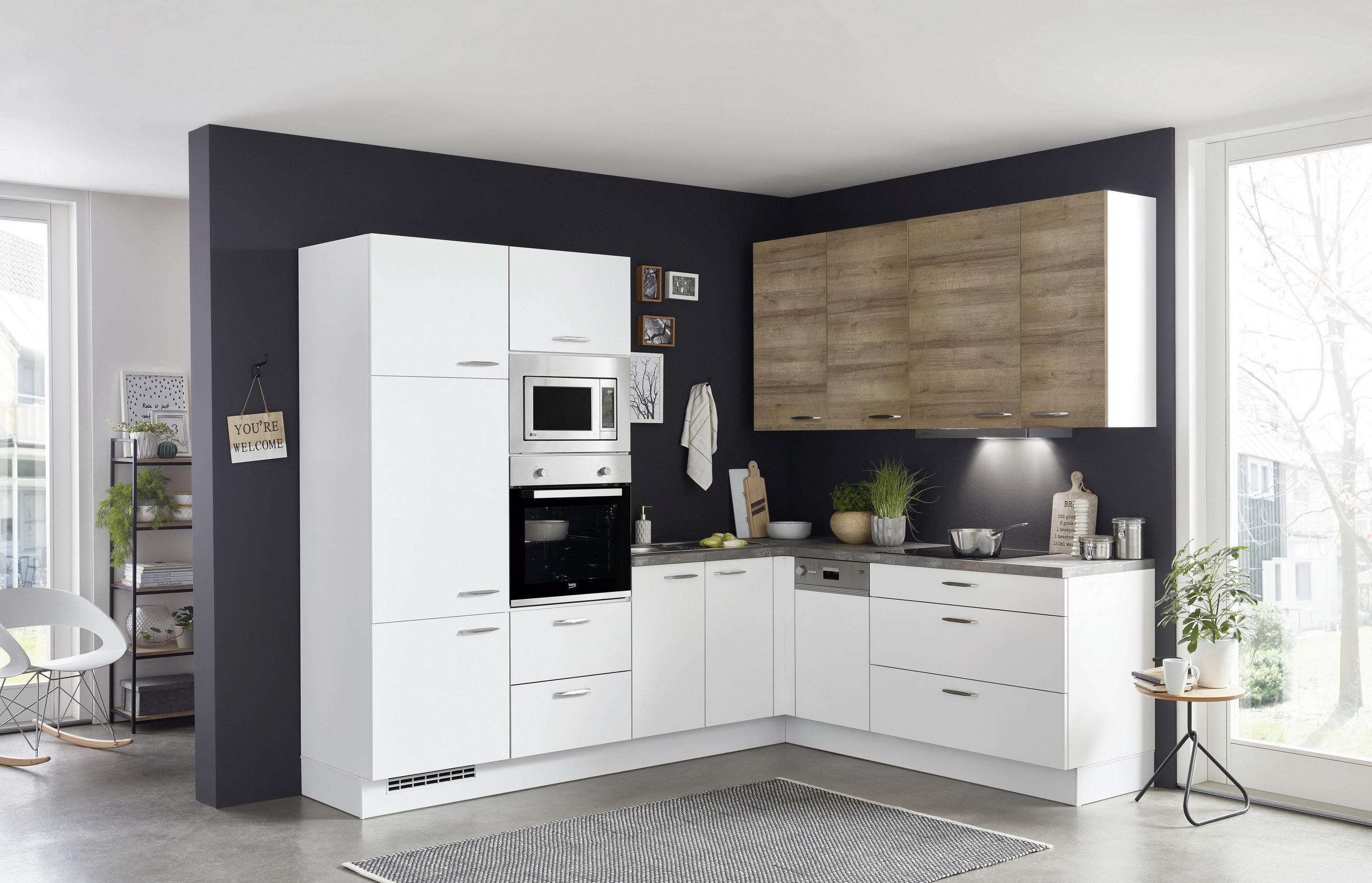 Tudi izbor kotnih kuhinj je v Lesnini zares velik. Očaral vas bo kuhinjski blok v obliki črke L Elvia, blagovne znamke Xora, ki se ponaša s preprosto, a učinkovito postavitvijo elementov. Izdelan je iz kakovostnega materiala, ki mu omogoča dolgo življenjsko dobo. Njegov dizajn v kombinaciji bele barve z mat/visokim sijajem se prilega številnim slogom stanovanj.