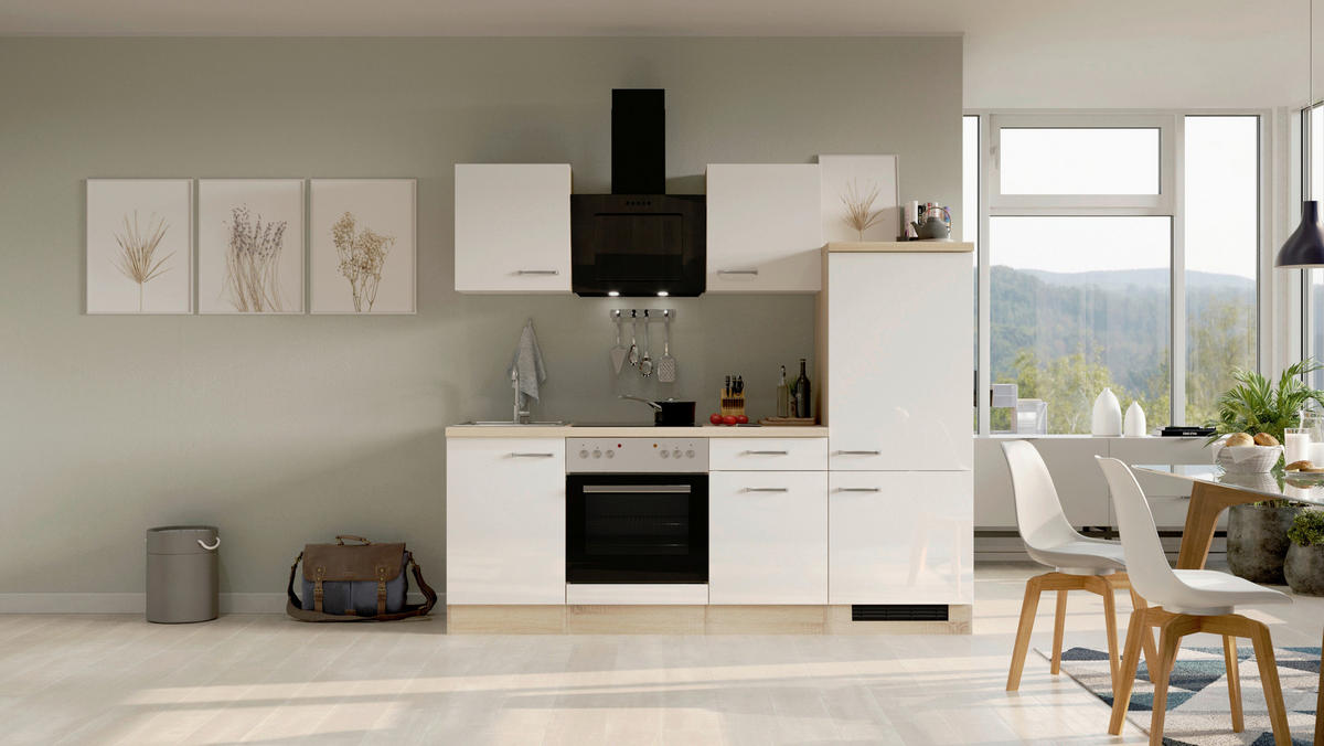 - vključeni električni aparati: kuhinjska napa, vgradni štedilnik, hladilnik z zamrzovalnim predalom, steklokeramična kuhalna plošča